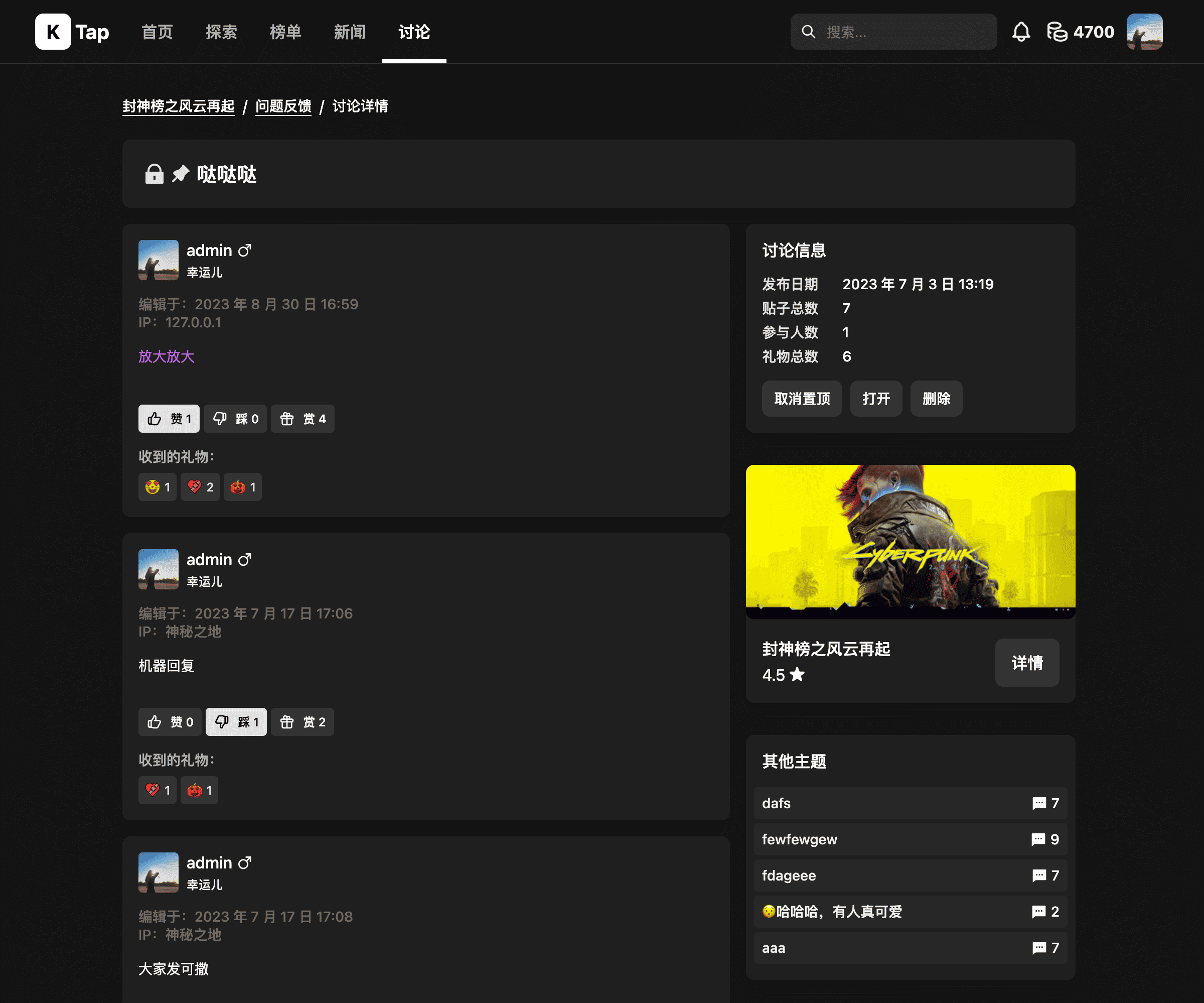 - 讨论:发帖、回帖、礼物、赞踩等。